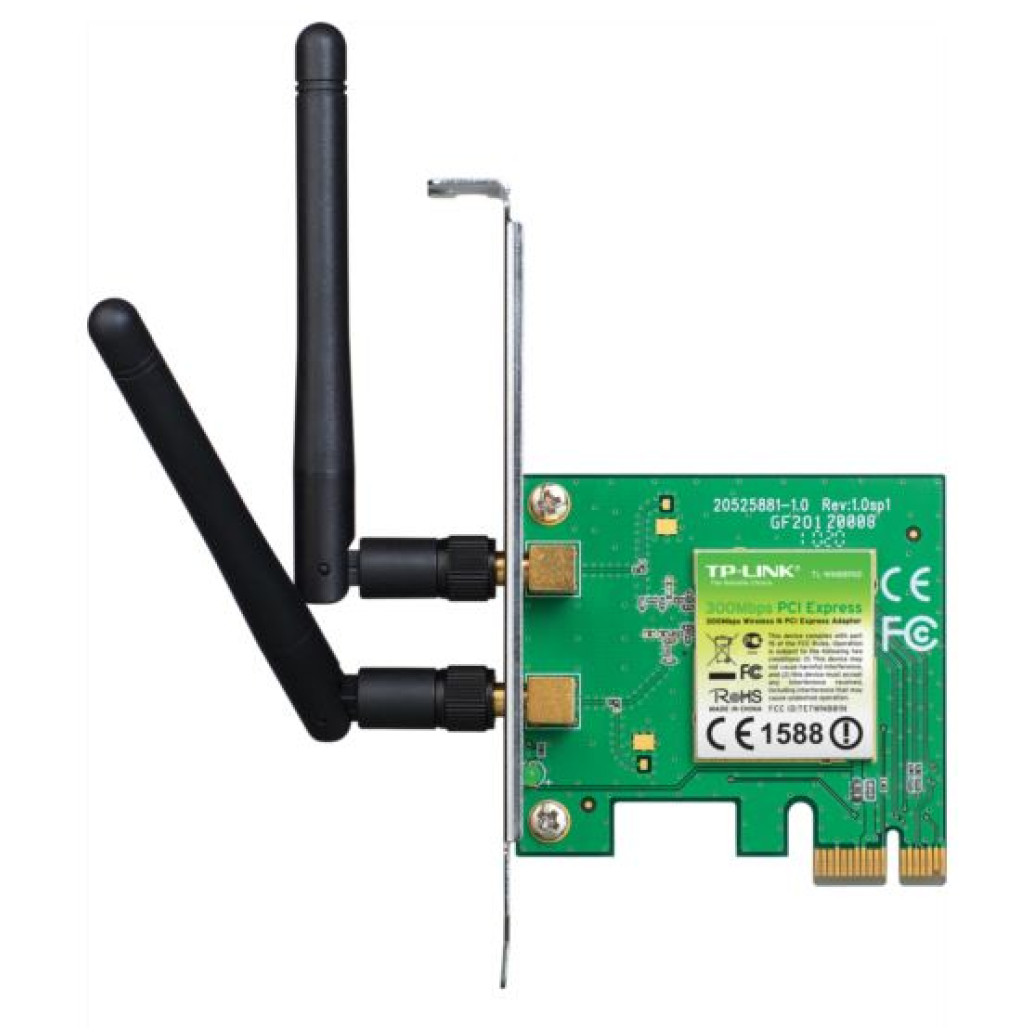 TP-LINK TL-WN881ND. Vgrajeno. Tehnologija povezovanja: Brezžična, Vmesnik gostitelja: PCI Express, Vmesnik: WLAN. Največja hitrost prenosa podatkov: 300 Mbit/s, Najvišji standard WLAN: Wi-Fi 4 (802.11n), pas WLAN: enopasovni (2,4 GHz). Barva izdelka: zelena