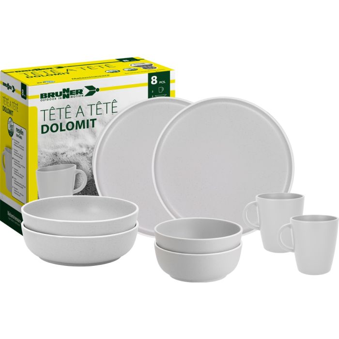 Brunner Tête-à-Tête Dolomit  je visokokakovosten 8-delni komplet posode za dve osebi, zasnovan posebej za uporabo na prostem. Izdelan je iz melamina, ki je znan po svoji trpežnosti in odpornosti na udarce, hkrati pa nudi estetski videz, podoben porcelanu.