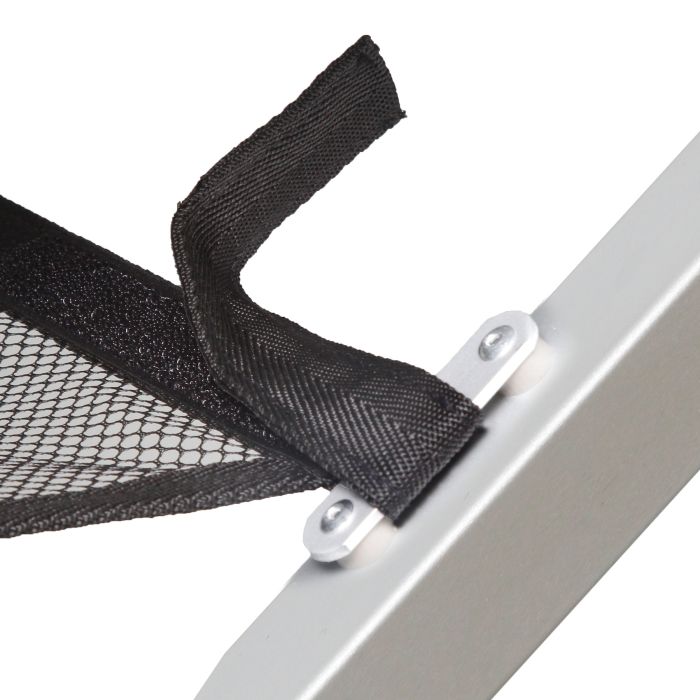 Patentirana miza iz aluminija z enostavno zložljivim okvirjem. Odlikuje jo mrežasti prostor za odlaganje. Stabilen okvir iz kvadratnih aluminijastih cevi z nastavitvijo višine.