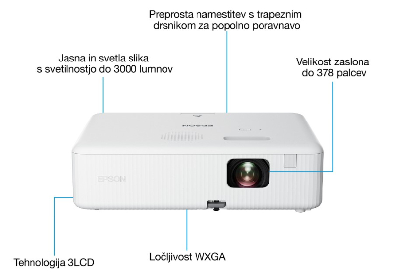 Predstavljamo projektor, ki bo navdušil vse družinske člane. Ta projektor ločljivosti WXGA ima vse potrebno za ogled filmskih uspešnic in predvajanje ostrih predstavitev. Svetlost okolja ni več težava; s 3.000 lumni in tehnologijo 3LCD zagotavlja svetel ter jasen prikaz. Lahko ga prenašate in namestite brez težav. Zaradi izredno dolge življenjske dobe žarnice je cenovno zelo ugoden.