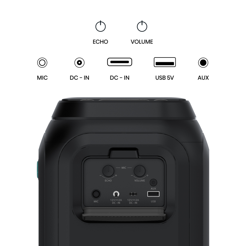 Doživite bogate, gromozanske base z dvema vgrajenima subwooferjema, zasnovanima za globok zvok. Uživajte v kristalno čistih visokih tonih, saj 2 vgrajena tweeterja prinašata ostre, visoke tone, kar ustvarja nepozabno vzdušje zabave.