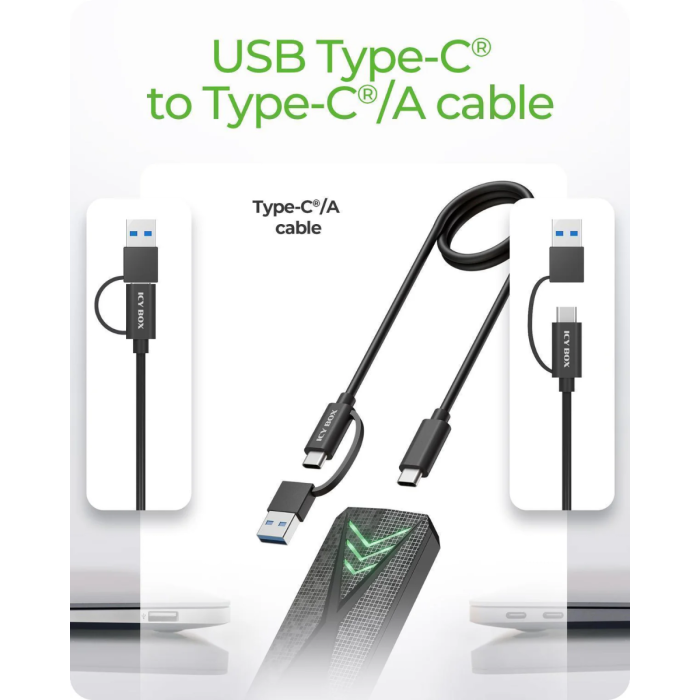 Opremljen z USB 3.2 Gen 2 Type-C® omogoča hitrosti prenosa do 10 Gbit/s. Priložen 60 cm USB Type-C® na Type-C®/A kombiniran kabel zagotavlja fleksibilno povezljivost z različnimi napravami.