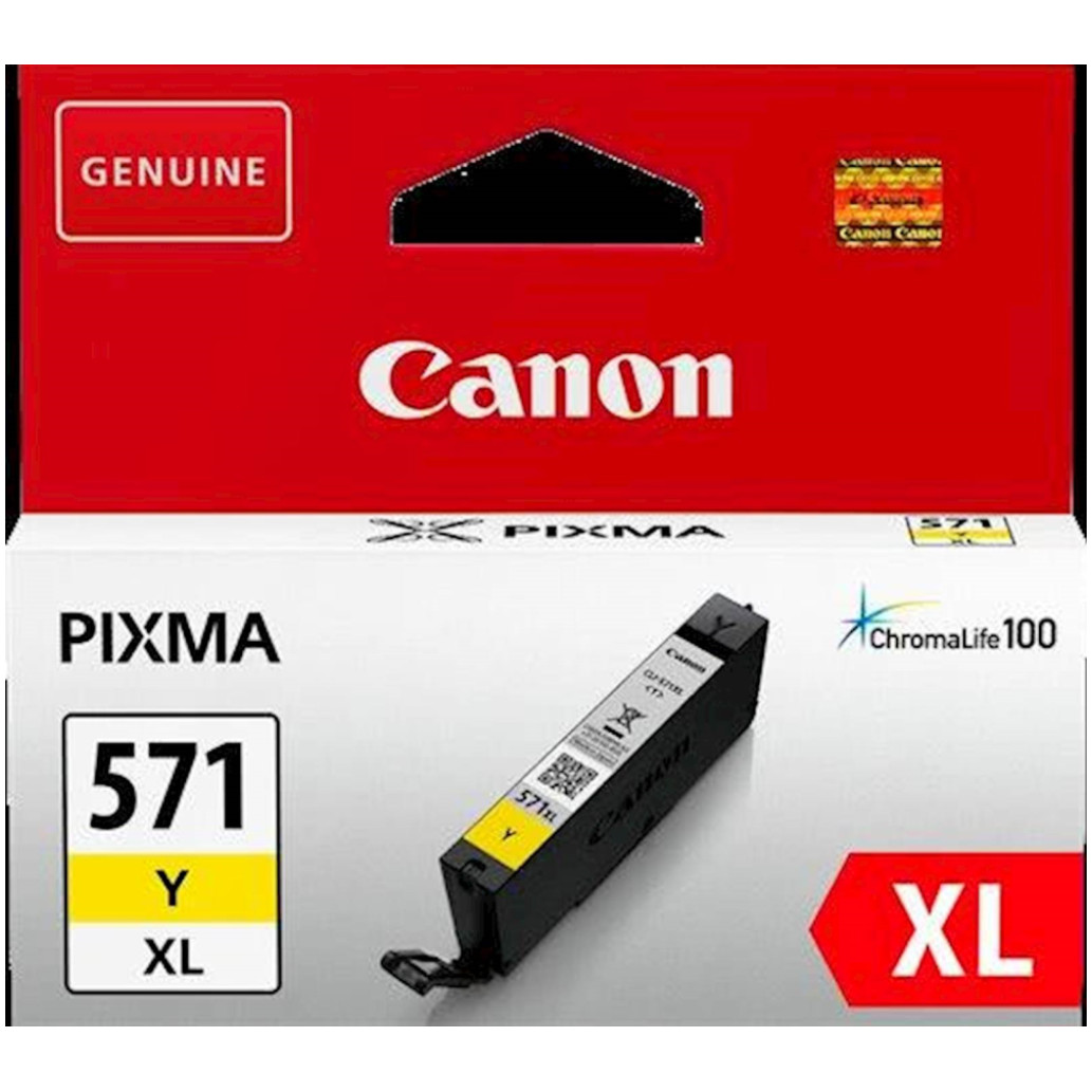 Canon CLI-571Y XL. Kapaciteta kartuše s črnilom: Visok izkoristek (XL), Vrsta barvnega črnila: Črnilo na osnovi pigmenta, Kapaciteta strani z barvnim črnilom: 715 strani, Prostornina barvnega črnila: 11 ml, Količina v pakiranju: 1 kos