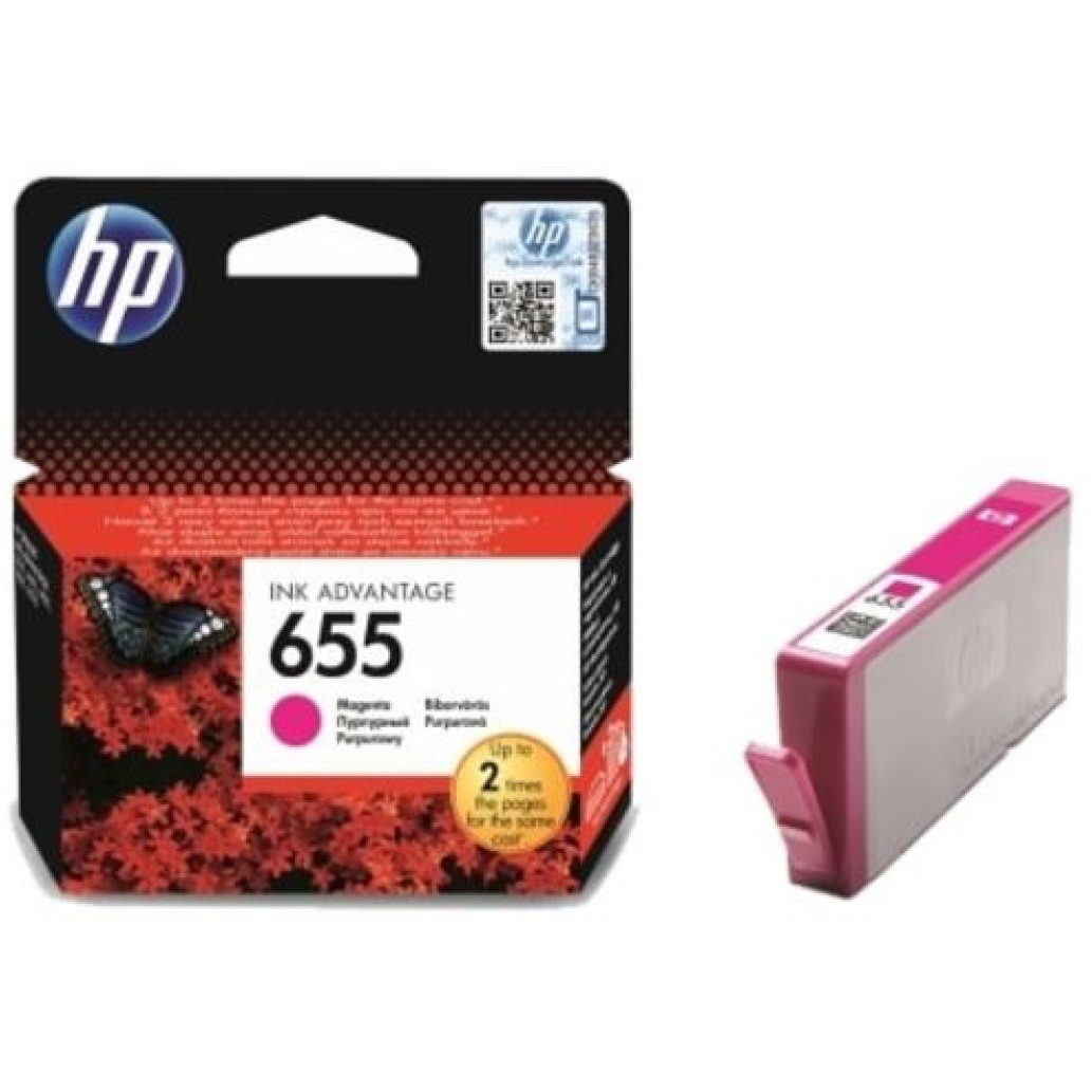 HP 655 Magenta Original Ink Advantage kartuša. Vrsta barvnega črnila: Črnilo na osnovi barvila, Kapaciteta strani z barvnim črnilom: 600 strani, Količina v pakiranju: 1 kos