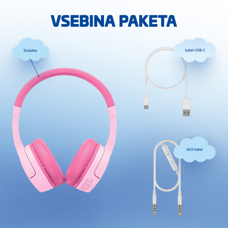 brezžične slušalke LAMAX BaseKid1 to omogočile. Doma ali na poti se potopijo v svojo najljubšo pravljico ali gledajo zanimive videe, starši pa niso nori na pesmico, ki jo otrok večkrat predvaja. Poslušanje je maksimalno varno zahvaljujoč omejitvi glasnosti na 85 ali 94 dB in hkrati udobno, za kar poskrbijo mehki hipoalergenski ušesni nastavki. Ne glede na to, kaj otrok počne, slušalke ostanejo na mestu, saj je most med ušesnimi čašicami prožen in skoraj neuničljiv. Uporabljajo se lahko povezani preko žice ali Bluetooth 5.3, ko baterija zdrži do 35 ur pri zmanjšani glasnosti. Polnjenje je tako hitro, da 10 minut zadostuje za 2 uri poslušanja. Vgrajeni mikrofon bo otrokom dodal pomen, ko jih na primer pokliče babica. Upravljanje slušalk je enostavno in video navodila vam bodo pomagala pri tem.