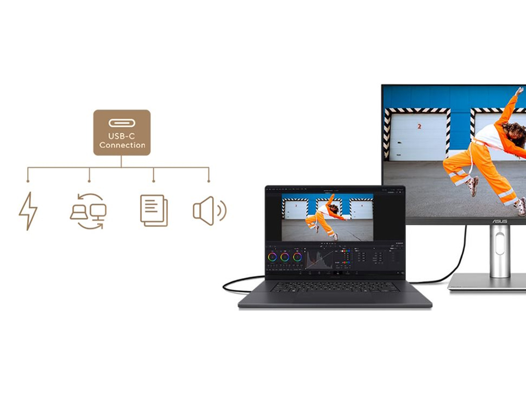 USB-C priključek omogoča izjemno hitre prenose podatkov, povezljivost DisplayPort in napajanje z močjo 96 W za polnjenje prenosnikov in drugih naprav – vse prek enega kabla. Monitor deluje tudi kot USB vozlišče: vsaka naprava, povezana na USB priključke monitorja, dobi dostop do drugih povezanih perifernih naprav. Vgrajena funkcija Auto KVM omogoča preprosto preklapljanje in upravljanje med dvema povezanima prenosnikoma ali računalnikoma z eno samo tipkovnico in miško, kar olajša večopravilnost. Poleg USB-C monitor ProArt ponuja številne možnosti povezljivosti, vključno s HDMI, DisplayPort, USB Type-A in dodatnim USB-C priključkom za povezovanje z različnimi napravami. PA27JCV vključuje tudi prehodni priključek za slušalke.