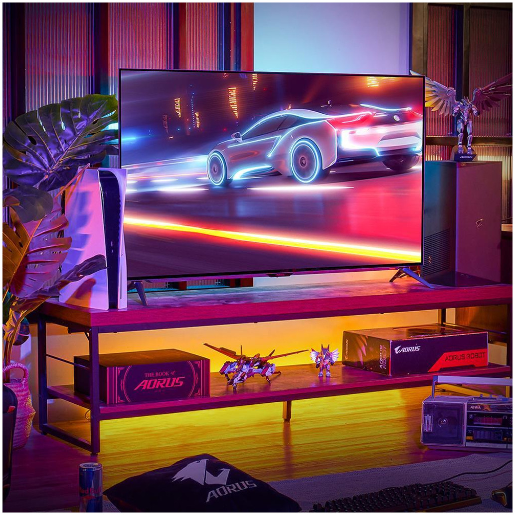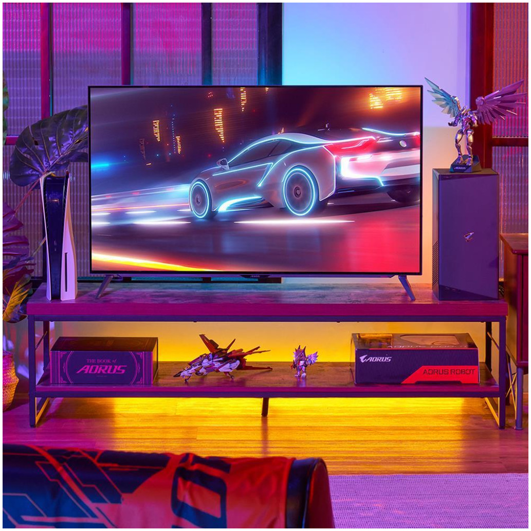 Gigabyte AORUS FO48U. Diagonala zaslona: 120,7 cm (47,5 palcev), ločljivost zaslona: 3840 x 2160 slikovnih pik, vrsta HD: 4K Ultra HD, tehnologija zaslona: OLED, odzivni čas: 1 ms, izvorno razmerje stranic: 16:9, vodoravni kot slike: 178° , kot slike , navpično: 178°. Vgrajeni zvočniki. Vgrajeno zvezdišče USB, nosilec VESA. Barva izdelka: Črna