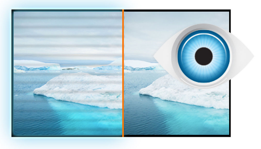 FILTER MODRE SVETLOBE Kot vsi vemo, večurno gledanje v zaslon monitorja na dan, še posebej od blizu, povzroča utrujenost oči. Ta učinek je veliko močnejši pri računalniških zaslonih kot pri televizijski opremi. Eden od dejavnikov, odgovornih za ta pojav, je modra svetloba, ki jo oddaja zaslon. Zato zmanjšanje količine modre svetlobe omogoči, da se naše oči med dolgim delom z računalniškim zaslonom počutijo manj utrujene. To smo dosegli s prilagoditvijo svetlosti in barvne temperature monitorja z novo funkcijo, imenovano ?Zmanjšanje modre svetlobe?, ki je zlahka dostopna prek OSD menija monitorja.