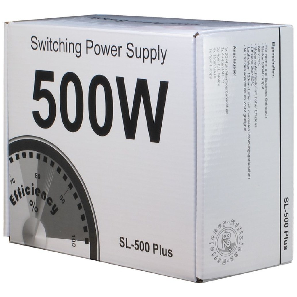 Inter-Tech SL-500 Plus. Skupna moč: 500 W, AC vhodna napetost: 230 V, AC vhodna frekvenca: 50 – 60 Hz Priključek za matično ploščo: 20 + 4 pin ATX, dolžina napajalnega kabla PCI Express: 45 cm, dolžina napajalnega kabla CPU: 45 cm. Namen: osebni računalnik, napajalna enota (PSU) Faktor oblike: ATX, raven hrupa: 25 dB. Barva izdelka: srebrna, hlajenje: aktivno, premer ventilatorja: 12 cm. Širina: 150 mm, globina: 140 mm, višina: 86 mm