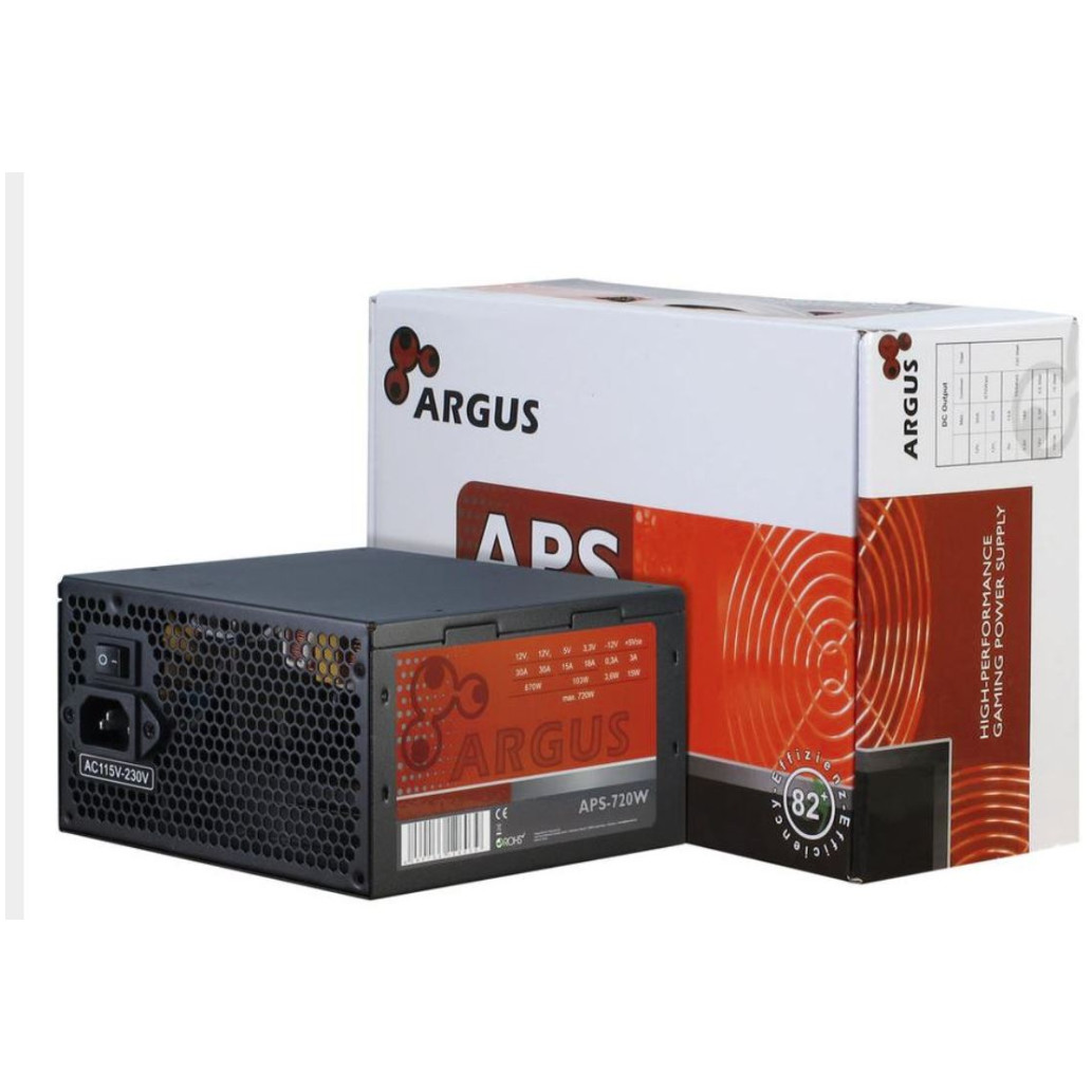 Inter-Tech Argus APS. Skupna moč: 720 W, AC vhodna napetost: 115 – 230 V, AC vhodna frekvenca: 47 – 63 Hz Konektor za matično ploščo: 20 + 4 pin ATX. Namen: osebni računalnik, napajalnik (PSU) Faktor oblike: ATX, raven hrupa: 21 dB. Barva izdelka: Črna, Premer ventilatorja: 12 cm, Število ventilatorjev: 1 ventilator. Širina: 150 mm, globina: 140 mm, višina: 86 mm