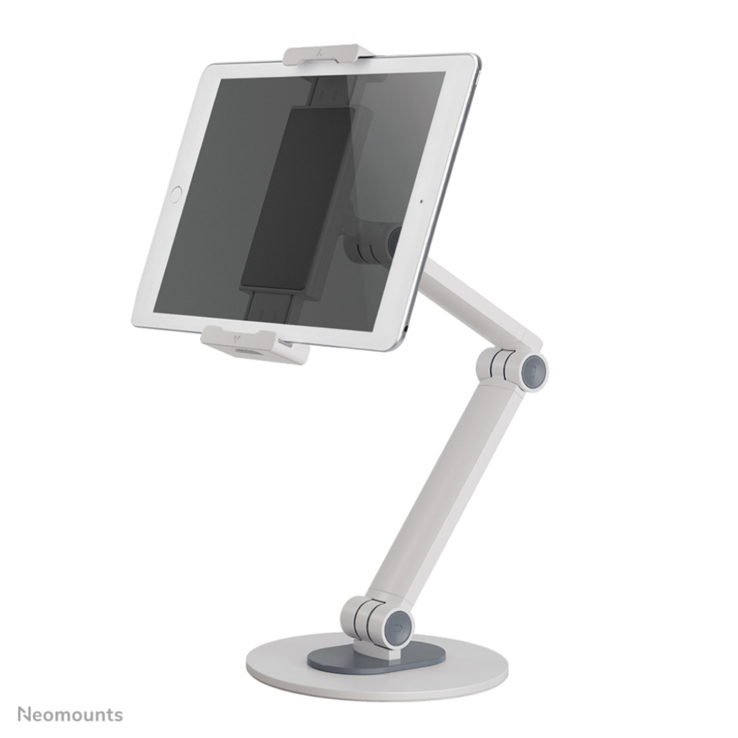 Neomount by Newstar DS15-550WH1 je univerzalno stojalo za tablice od 4,7 do 12,9″ in nosilnosti 1 kg. Stojalo za tablični računalnik ima 3 vrtljive točke in je idealno za prostoročne video klice, gledanje filma ali igranje iger. Zahvaljujoč integriranemu krogličnemu zglobu je stojalo mogoče zavrteti za 360°, tako da lahko preklapljate med pokončnim in ležečim formatom. Poleg tega omogočata pametni nagib (270°) in vrtenje (104°) stojala, da nastavite idealen kot gledanja. Mehke gumijaste blazinice ščitijo vašo napravo pred praskami, trdna podlaga z nedrsečimi silikonskimi blazinicami pa zagotavlja varno namestitev vaše naprave..