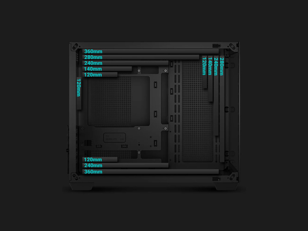 Kljub kompaktnim dimenzijam ohišje ponuja široko združljivost: podpira grafične kartice do 410 mm, napajalnike ATX do 200 mm in hladilnike procesorja do 164 mm. S 5 režami PCIe sprejme večino sodobnih grafičnih in razširitvenih kartic, možnosti shranjevanja pa vključujejo do 2× 3,5″ in 4× 2,5″ SSD, kar omogoča prilagodljivo ravnovesje med kapaciteto in hitrostjo.