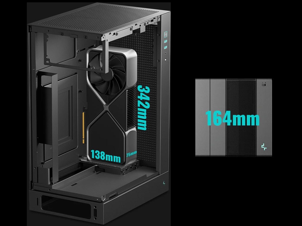 Mesh stranice poskrbijo za odličen pretok zraka. Ena stranica iz kaljenega stekla pa poskrbi za odličen pogled na komponente v notranjosti. CH170 PLUS sprejme tudi grafične kartice do dolžine 342 mm in širine do 138 mm. Grafične kartice lahko priključite naravnost na matično ploščo.