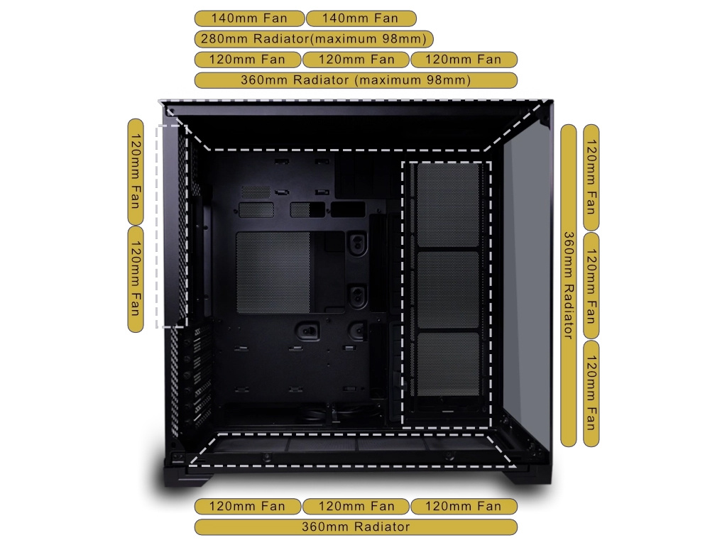 Ohišje omogoča uporabo z zgornjo stranico iz mreže ali iz kaljenega stekla. Mrežasta sestava je primerna za uporabo z AIO namestitvijo, sestava s steklom pa ponuja 270° pogled na notranjost.