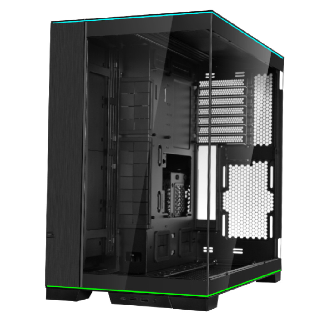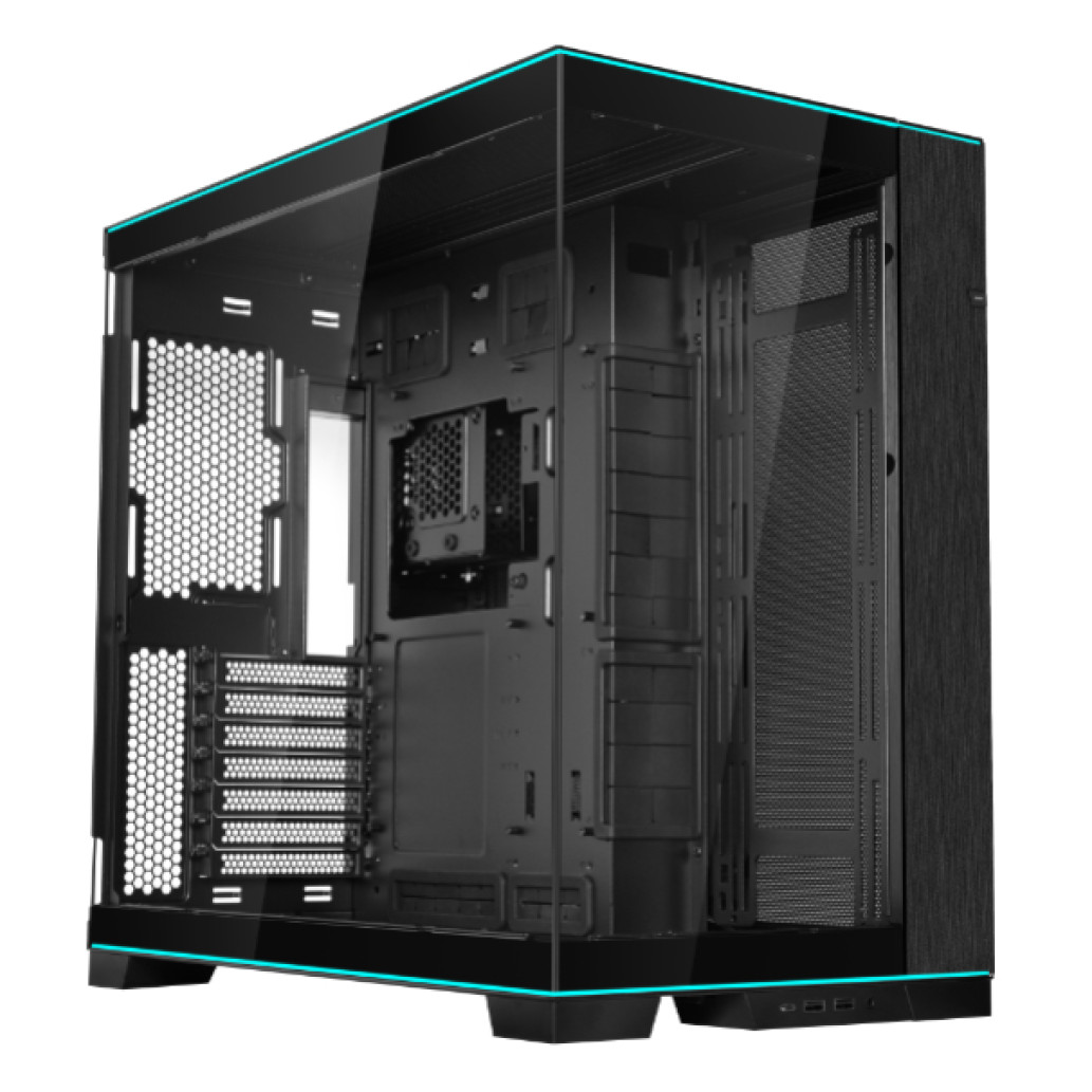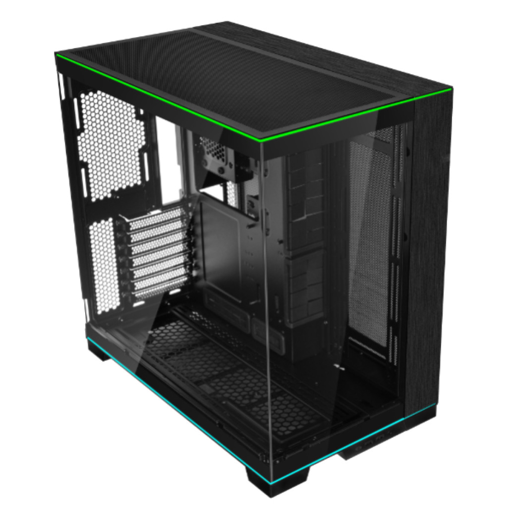 Ohišje O11D EVO RGB ima zgoraj in spodaj RGB 1,5 mm debel LED trak, ki poteka v obliki črkle L. Omogoča osvetlitev v 14 različnih svetlobnih učinkih, enostavno prilagoditev svetlosti in sinhronizacijo z osvetlitvijo na matični plošči.