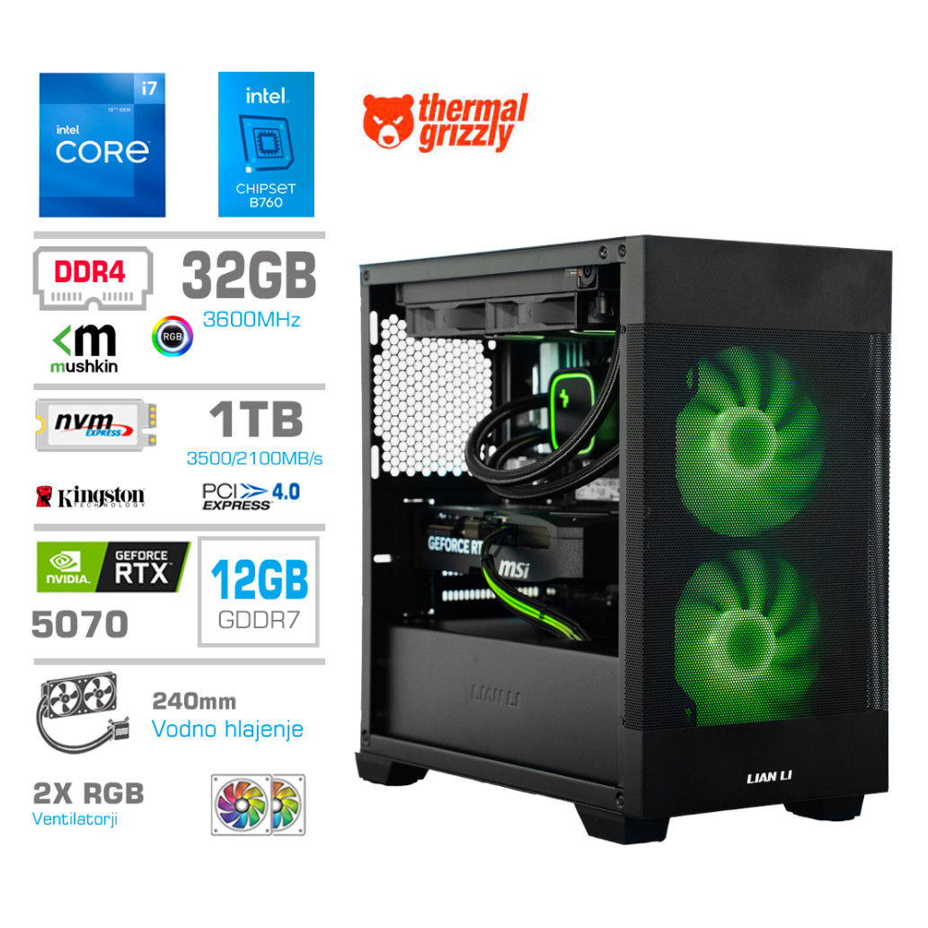 Računalnik MEGA MT S7X i7-12700K/RTX5070/32GB/1TB-4.0/750W/Brez OS/črna RGB + Estetski napajalni kabli [Zelena / Črna)
