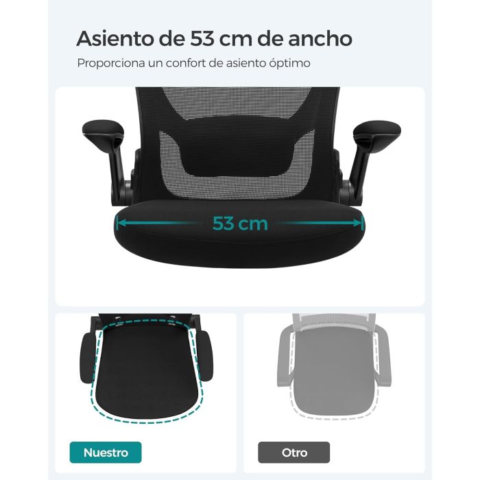 SONGMICS pisarniški stol, pisarniški stol, mrežasti vrtljivi, ergonomski računalniški stol, ledvena podpora, nihajoči, sedež 53 cm, zložljivi nasloni za roke, črn OBN37BK