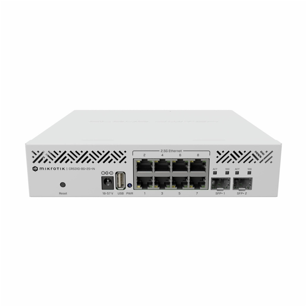 Mikrotik stikalo CRS310-8G+2S+IN ponuja osem 2,5 Gigabitnih Ethernet in dva 10 Gigabitna SFP+ priključka, ki zagotavljata izjemno hitro povezljivost v kompaktnem ohišju. Z vgrajenim Marvell 98DX226S veznim naborom in dvojedrnim ARM CPU lahko izvajate napredne funkcije.