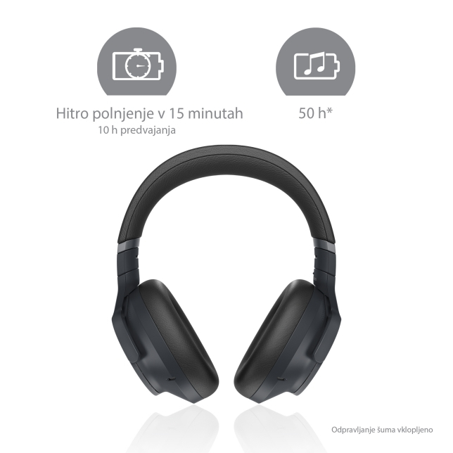 Z enim polnjenjem lahko slušalke z vklopljenim odstranjevanjem hrupa uporabljate do 50 ur, hitro, 15-minutno polnjenje zadošča za 10 ur predvajanja; senzor nošenja za samodejni izklop; zlahka se zložijo v kompaktno torbico za prenašanje.