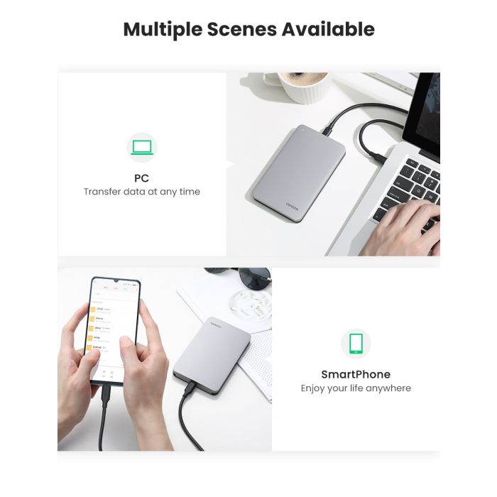 Ohišje trdega diska vsebuje najnovejša vrata USB-C 3.1 Gen 2, ki podpirajo hitrost prenosa podatkov 10 Gbps (7 + 15) Pin SATA III podpira največ 6Gbps prenos podatkov. Okrepljeno s pospešenimi protokoli za prenos – UASP (USB Attached SCSI Protocol) in TRIM omogoča, da ohišje trdega diska v celoti izkoristiti prednosti pogonov SSD.
