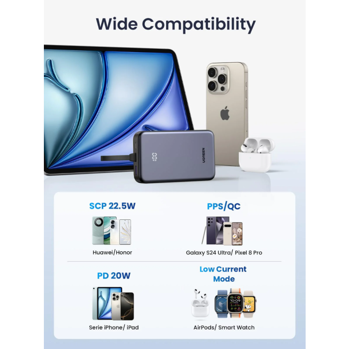 Podpira protokole PD3.0, QC3.0, FCP, SCP in AFC, kar zagotavlja združljivost z večino pametnih telefonov, tablic in celo naprav z nizko porabo energije, kot so pametne ure in slušalke Bluetooth.