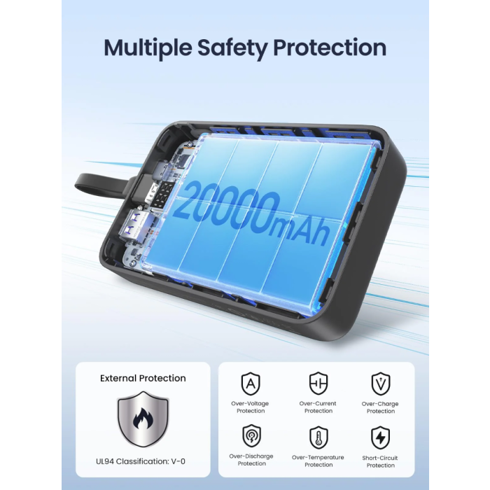 Podpira 22,5 W super hitro polnjenje in 20 W PD3.0, s čimer napolni vaš telefon do 55 % v samo 30 minutah. Tako vhod kot izhod podpirata hitro polnjenje za maksimalno učinkovitost.