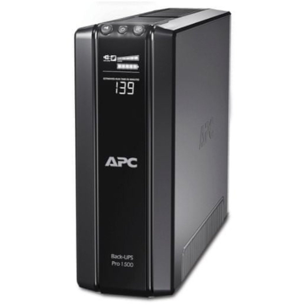 APC Back-UPS Pro. Topologija UPS: Line-interactive, Izhodna zmogljivost: 1,5 kVA, Izhodna moč: 865 W. Vrste AC konektorjev: C13 spojnik, Priključki: C14 spojnik, Število AC vtičnic: 10 AC vtičnic. Tehnologija baterije: Zapečatena svinčena kislina (VRLA), Kapaciteta baterije: 187 VAh, Tipičen čas rezervne obremenitve: 3,7 min Barva izdelka: Črna, Zaslon: LCD, Certifikat: A-tick, C-tick, CE, GOST, GS Mark, teledovoljenje, TUV, REACH, PEP, EOLI, Nemko-GS. Širina: 112 mm Globina: 380 mm Višina: 301 mm