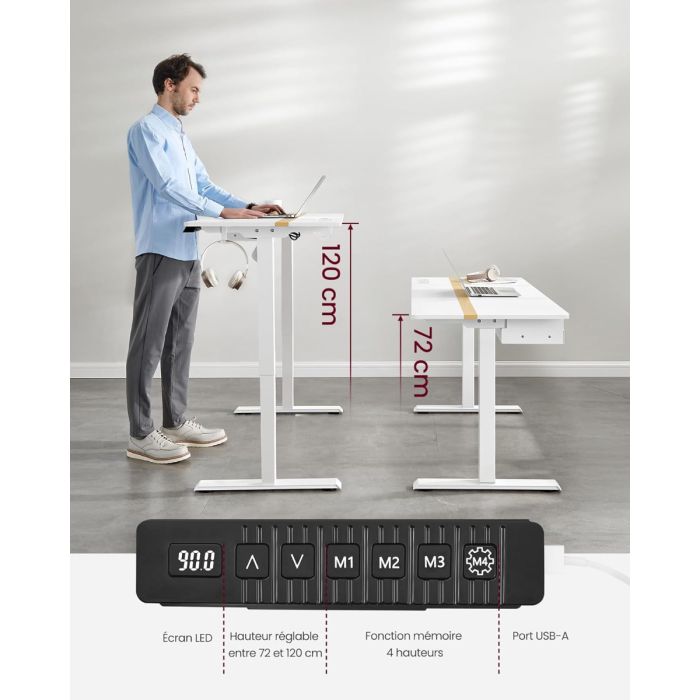 Električno nastavljiva pisalna miza VASAGLE omogoča prilagoditev višine med 72 in 120 cm, kar vam omogoča preklapljanje med sedenjem in stanjem med delom. Miza ima funkcijo pomnilnika za štiri različne višine, kar omogoča enostavno prilagajanje glede na vaše potrebe. Površina mize meri 60 x 140 cm, kar zagotavlja dovolj prostora za vaše delovne pripomočke.