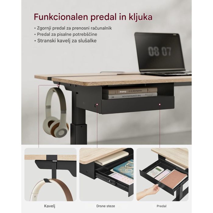 • Prostorna delovna površina: S površino 60 x 140 cm nudi dovolj prostora za računalnik, dokumente in druge delovne pripomočke.